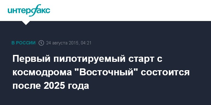 Москва. 24 августа. INTERFAX.RU - Первый пилотируемый полет с космодрома "Восточный" состоится после 2025 года, пишут в понедельник "Известия", ссылаясь на проект Федеральной космической программы на 2016-2025 годы (ФКП-2025), который был разослан в министерства.