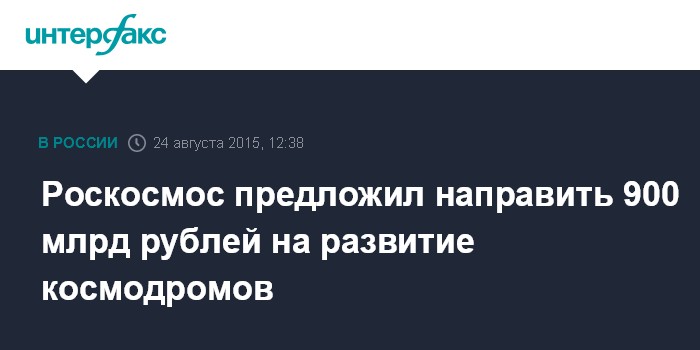 Москва. 24 августа. INTERFAX.RU - Федеральное космическое агентство предлагает направить на развитие российских космодромов в период с 2016 по 2025 годы около 900 млрд рублей, сообщил журналистам глава Научно- технического совета Роскосмоса Юрий Коптев.