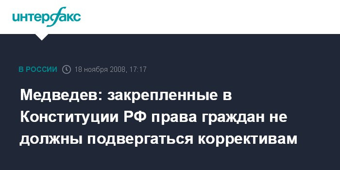 Москва. 18 ноября. INTERFAX.RU - Президент России Дмитрий Медведев не видит ничего страшного в корректировке положений, касающихся политической системы РФ, которые закреплены в Конституции РФ. Главное, по его словам, это неизменность прав граждан.