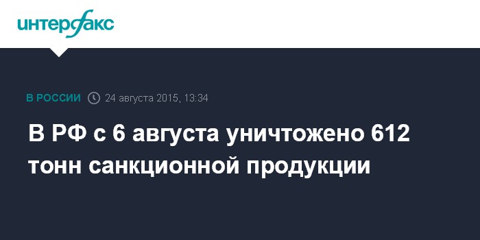 Москва. 24 августа. INTERFAX.RU - В России, по данным на 23 августа, уничтожено 612 тонн санкционной продукции.