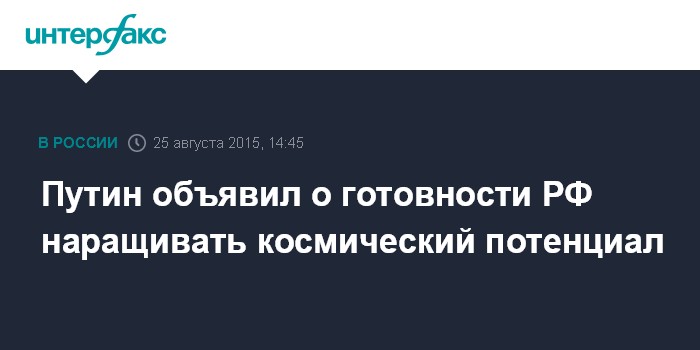 Москва. 25 августа. INTERFAX.RU - Россия намерена наращивать космический потенциал и производство военной авиатехники, заявил президент РФ Владимир Путин.