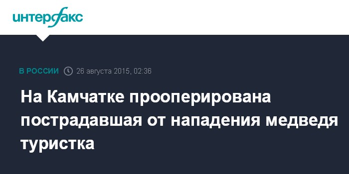 Москва. 26 августа. INTERFAX.RU - Туристку, госпитализированную после нападения медведя, произошедшего у вулкана Плоский Толбачик на Камчатке, доставят вертолетом в Петропавловск-Камчатский.