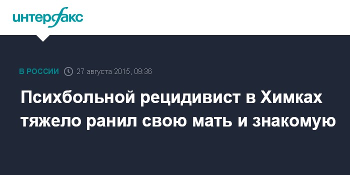 Москва. 27 августа. INTERFAX.RU - Психически больной мужчина, ранее судимый за попытку убийства, нанес тяжелые ранения своей матери и знакомой в подмосковных Химках, сообщили "Интерфаксу" в пресс-центре МВД России.