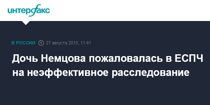 Москва. 27 августа. INTERFAX.RU - Дочь оппозиционного политика Бориса Немцова, который был убит в Москве в феврале, пожаловалась на действия российских властей в Европейский суд по правам человека (ЕСПЧ), сообщил адвокат Жанны Немцовой Вадим Прохоров.