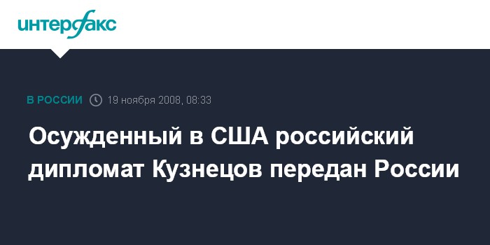 Москва. 19 ноября. INTERFAX.RU - Высокопоставленный сотрудник ООН, российский дипломат Владимир Кузнецов, осужденный в США, передан российским властям во вторник, сообщили в эфире "НТВ" в среду.