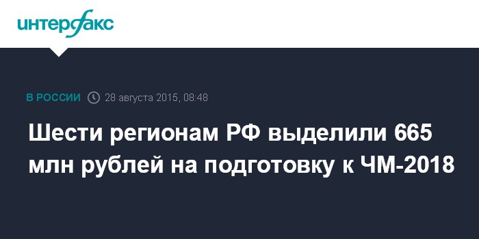 "Подписанным распоряжением утверждено распределение субсидий в размере 664,7 млн рублей, предоставляемых в 2015 году из федерального бюджета бюджетам республик Мордовия и Татарстан, Волгоградской, Нижегородской, Ростовской и Самарской областей на софинансирование объектов инфраструктуры, обеспечивающих функционирование спортивных объектов, необходимых для подготовки к проведению в 2018 году в России Чемпионата мира по футболу", - говорится в сообщении.