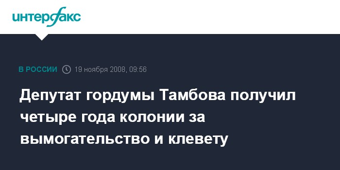 Москва. 19 ноября. INTERFAX.RU - В Тамбове депутат городской думы, бывший координатор регионального отделения ЛДПР Алексей Гринчук осужден Ленинским районным судом на четыре года лишения свободы с отбыванием в колонии общего режима за клевету и вымогательство.