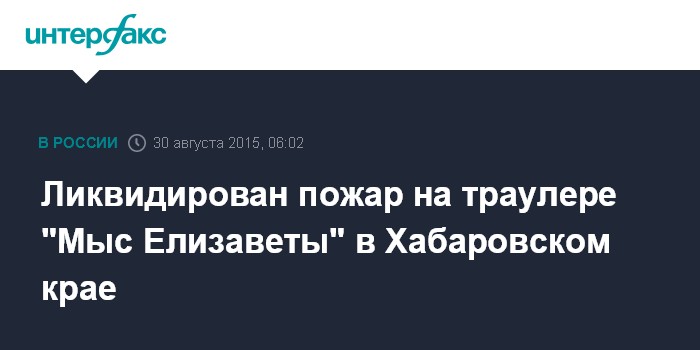 Москва. 30 августа. INTERFAX.RU - Завершены работы по ликвидации пожара на рыболовецком траулере "Мыс Елизаветы", который загорелся в четверг в порту Советская Гавань в Хабаровском крае, сообщил агентству "Интерфакс" представитель Главного управления МЧС России по Хабаровскому краю