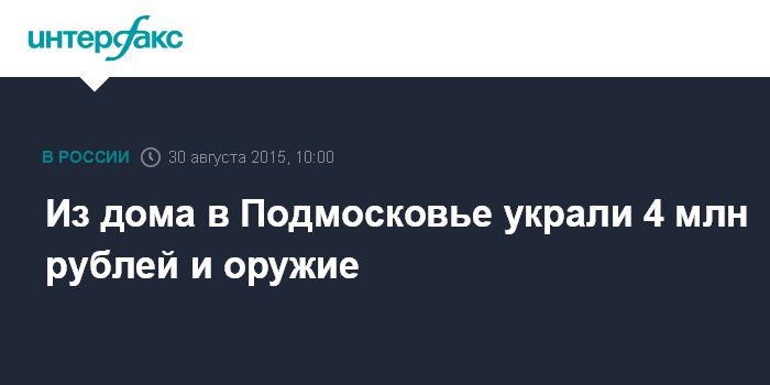Москва. 30 августа. INTERFAX.RU - Неизвестный похитил из частного дома гендиректора коммерческой фирмы в Звенигороде деньги и оружие на сумму более 4 млн рублей, сообщили "Интерфаксу" в воскресенье в пресс-центре МВД РФ.