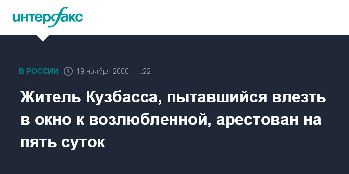 Москва. 19 ноября. INTERFAX.RU - В городе Тайга Кемеровской области задержан нетрезвый молодой человек, пытавшийся через окно третьего этажа общежития профессионального училища проникнуть к своей возлюбленной.