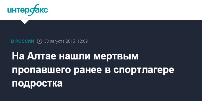 Москва. 30 августа. INTERFAX.RU - Близ города Бийска в Алтайском крае обнаружено тело 14-летнего подростка, пропавшего 20 августа во время отдыха в спортивном лагере "Факел", сообщает в воскресенье пресс-служба краевого следственного управления СКР.