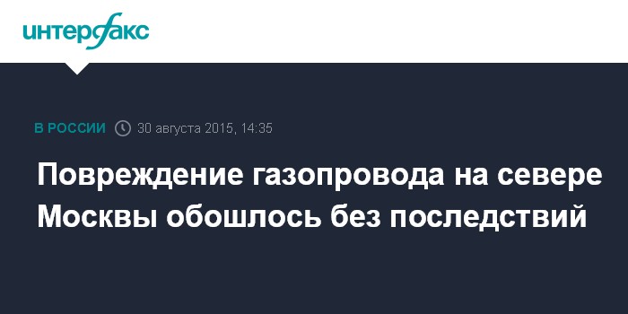 Москва. 30 августа. INTERFAX.RU - Повреждение газопровода в 3-м Нижнелихоборском проезде не представляет угрозы для людей, инцидент не привел к отключению потребителей, сообщила "Интерфаксу" в воскресенье заместитель генерального директора по связям с общественностью ОАО "Мосгаз" Дарья Распопова.