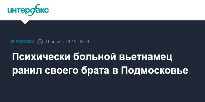 Москва. 31 августа. INTERFAX.RU - Страдающий психическим расстройством гражданин Вьетнама тяжело ранил своего младшего брата в подмосковном Орехово-Зуеве, сообщил "Интерфаксу" источник в правоохранительных органах в понедельник.