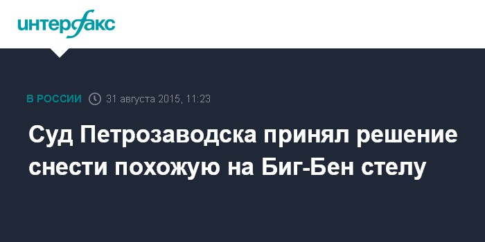 Москва. 31 августа. INTERFAX.RU - Петрозаводский городской суд удовлетворил требования группы архитекторов и постановил снести незаконно установленную в городе стелу с часами похожую на лондонский Биг-Бен.