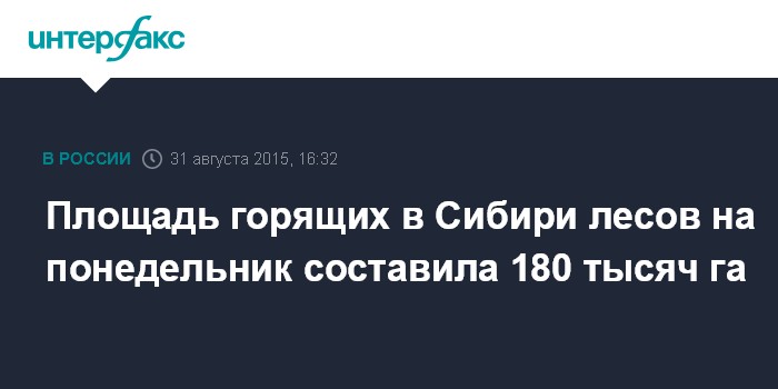 Москва. 31 августа. INTERFAX.RU - Площадь лесных пожаров в Сибири, по данным на понедельник, составляет 179 тысяч 377,7 га, на землях лесного фонда и особо охраняемых природных территорий зафиксировано 104 лесных пожара, сообщает департамент лесного хозяйства по Сибирскому федеральному округу.