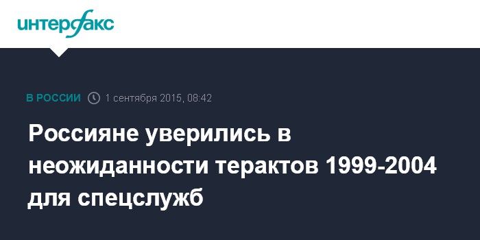 Москва. 1 сентября. INTERFAX.RU - Более трети россиян (35%) считают, что взрывы жилых домов в Москве и Волгодонске в 1999 году, захват заложников во время мюзикла "Норд-ост" в Москве в 2002 году и захват школы в Беслане в 2004 году были полной неожиданностью для российских спецслужб, сообщили "Интерфаксу" в "Левада-Центре".