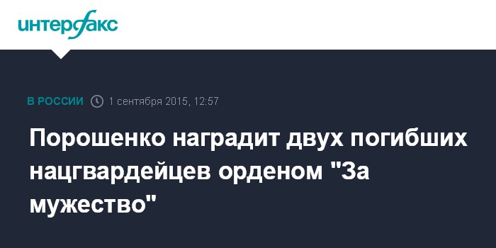 Москва. 1 сентября. INTERFAX.RU - Президент Украины Петр Порошенко наградит двух солдат Национальной гвардии, ставших жертвами беспорядков у здания Верховной рады 31 августа, орденами "За мужество".