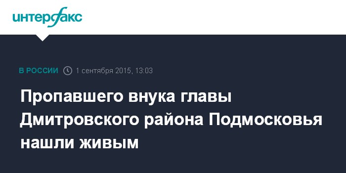 Москва. 1 сентября. INTERFAX.RU - Внук главы Дмитровского района Московской области Всеволод Лавров обнаружен, сообщает сайт поискового отряда "Лиза Алерт".