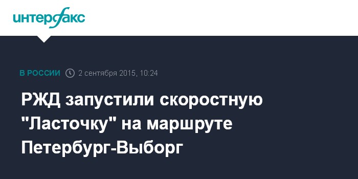 Москва. 2 сентября. INTERFAX.RU - ОАО "РЖД" в среду запустило движение скоростных электропоездов "Ласточка" по маршруту Петербург-Выборг, передал корреспондент "Интерфакса" с торжественной церемонии запуска.