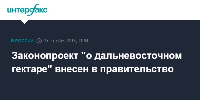 Москва. 2 сентября. INTERFAX.RU - Минэкономразвития РФ внесло в правительство разработанный совместно с Минвостокразвития законопроект "о дальневосточном гектаре", сообщил "Интерфаксу" глава Минвостокразвития Александр Галушка.