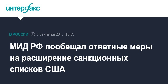 Москва. 2 сентября. INTERFAX.RU - Москва примет ответные меры в связи с расширением США антироссийских санкционных списков, заявили в МИД РФ.
