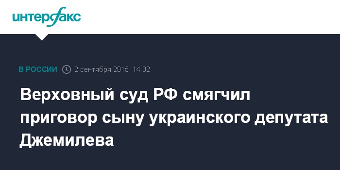 Москва. 2 сентября. INTERFAX.RU - Верховный суд РФ в среду смягчил на полтора года приговор сыну депутата парламента Украины Мустафы Джемилева Хайсеру, которого ранее суд в Краснодаре приговорил к пяти годам лишения свободы в колонии общего режима по обвинениям в убийстве по неосторожности, хищении и хранении оружия.