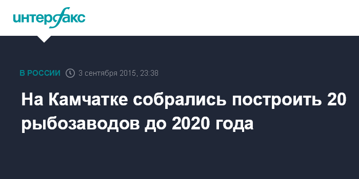 Москва. 3 сентября. INTERFAX.RU - До 2020 в Камчатском крае планируется построить порядка 20 рыбоводных заводов, что позволит увеличить объемы добычи лососей в среднем на 50 тыс. тонн, сообщает пресс-служба правительство Камчатского края.