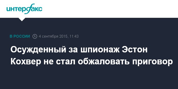 Москва. 4 сентября. INTERFAX.RU - Осужденный за шпионаж гражданин Эстонии Эстон Кохвер не стал обжаловать вынесенный ему Псковским областным судом приговор, и он вступил в силу.