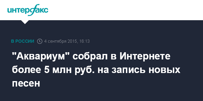 Москва. 4 сентября. INTERFAX.RU - Одна из старейших российских рок-групп "Аквариум" и ее бессменный лидер Борис Гребенщиков с помощью краудфандинга собрали в интернете более 5 млн рублей на запись и выпуск новых песен.