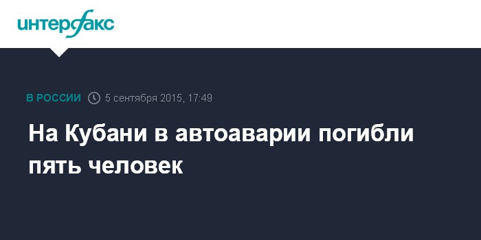 Москва. 5 сентября. INTERFAX.RU - Жертвами автоаварии в Белореченском районе Краснодарского края стали пять человек, двое из них - дети, сообщили "Интерфаксу" в субботу в экстренных службах региона.