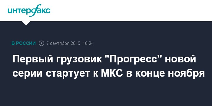 Москва. 7 сентября. INTERFAX.RU - Первый грузовой космический корабль новой серии "Прогресс-МС" стартует к Международной космической станции (МКС) в конце ноября, сообщили в понедельник "Интерфаксу" в ракетно-космической отрасли. Запуск ракеты-носителя "Союз-2.1а" с грузовиком "Прогресс-МС" запланирован на 21 ноября.