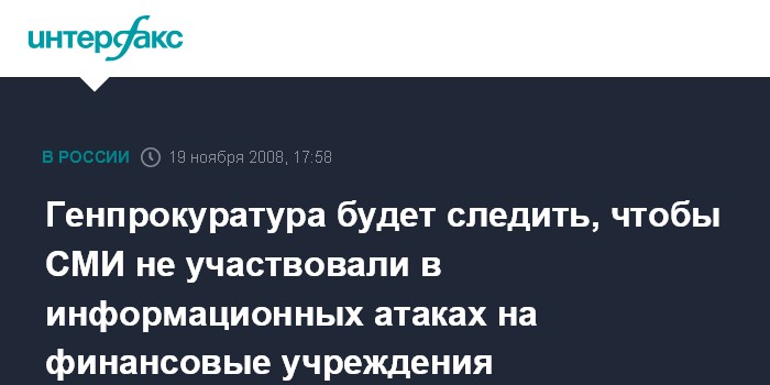 "Генпрокуратура не намерена устраивать некую цензуру в СМИ. Речь идет только о требовании соблюдать законодательство и публиковать достоверную информацию, не участвовать в информационных атаках на кредитные организации", - заявила "Интерфаксу" в среду официальный представитель Генпрокуратуры РФ Марина Гриднева.
