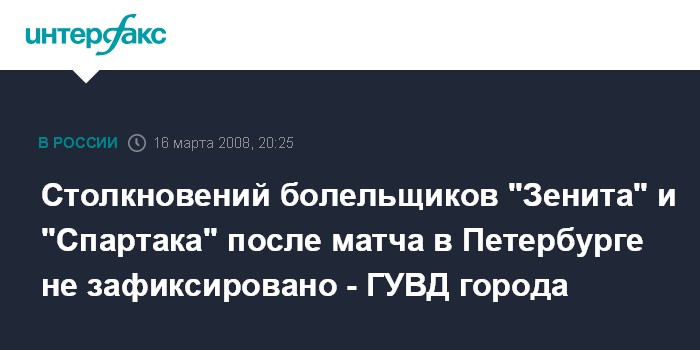 Санкт-Петербург.16 марта. ИНТЕРФАКС-СЕВЕРО-ЗАПАД - Беспорядков и столкновений до и после матча первого тура чемпионата России по футболу между "Зенитом" и "Спартаком" в Петербурге не зафиксировано, сообщили "Интерфаксу" в ГУВД города.
