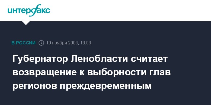 Москва. 19 ноября. INTERFAX.RU - Губернатор Петербурга Валерий Сердюков отмечает положительные изменения в управлении страной после введения назначений глав регионов и считает преждевременным возвращение к выборам. По мнению губернатора, "каждая система организации государства должна быть адекватной текущему моменту".