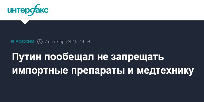 Москва. 7 сентября. INTERFAX.RU - Никаких запретов на продажу в России импортных лекарственных препаратов и медицинской техники нет и вводиться не будет, заявил президент РФ Владимир Путин.