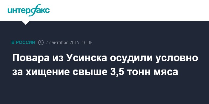 Москва. 7 сентября. INTERFAX.RU - Суд в Усинске (Коми) признал виновной повара строительной организации Викторию Филимонову, обвинявшейся в хищении почти четырех тонн мяса стоимостью 1,3 млн рублей, сообщает пресс-служба региональной прокуратуры.