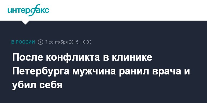 Москва. 7 сентября. INTERFAX.RU - Мужчина тяжело ранил из огнестрельного оружия врача петербургской больницы РЖД, после чего покончил с собой, сообщил "Интерфаксу" источник в правоохранительных органах города в понедельник.
