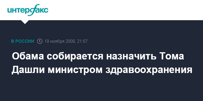 Москва. 19 ноября. INTERFAX.RU - Избранный президент США Барак Обама планирует назначить на пост министра здравоохранения и социальных служб в своей будущей администрации демократа Тома Дашли, сообщают в среду американские СМИ.