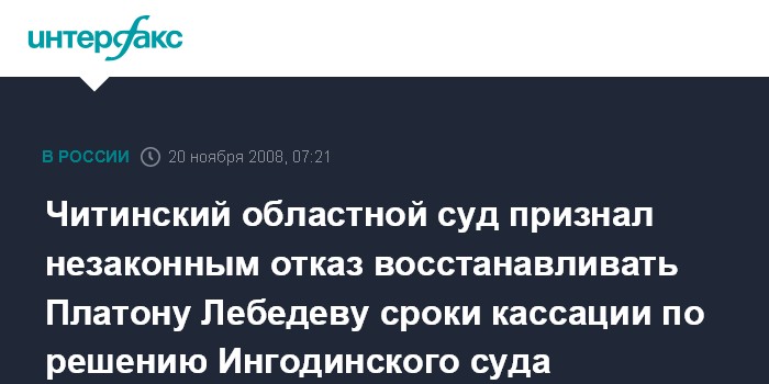 Чита. 20 ноября. ИНТЕРФАКС - Читинский областной суд признал незаконным решение председателя Ингодинского районного суда Читы, отказать бывшему руководителю МФО "МЕНАТЕП" Платону Лебедеву в восстановлении сроков кассационного обжалования по предыдущему решению Ингодинского суда об отказе принять жалобы адвокатов.