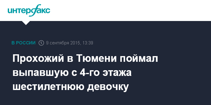 Москва. 9 сентября. INTERFAX.RU - Шестилетнюю девочку, выпавшую утром в среду с четвертого этажа жилого дома в Тюмени, поймал прохожий. Об этом агентству "Интерфакс" сообщил сотрудник пресс-службы городского УМВД.