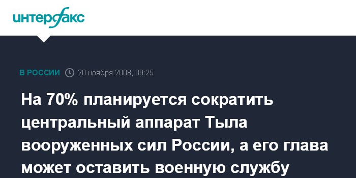 "В результате сокращения в центральном аппарате Тыла сохранится немногим более 300 должностей, из которых 60% займут военнослужащие и 40% гражданские", - сказал собеседник агентства.