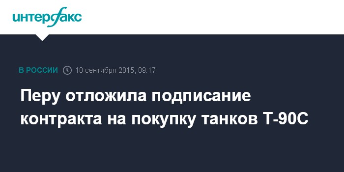 Москва. 10 сентября. INTERFAX.RU - Вопрос закупки российских танков Т-90С Перу отложен на среднесрочную перспективу, сообщили в "Рособоронэкспорте".