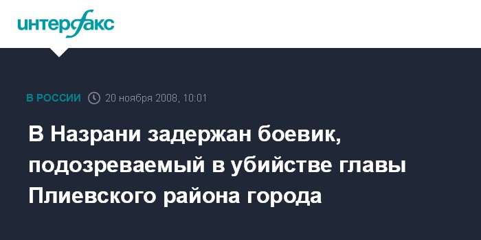 Москва. 20 ноября. INTERFAX.RU - В Назрани сотрудники правоохранительных органов задержали участника незаконного вооруженного формирования по подозрению в убийстве главы Плиевского муниципального округа города.