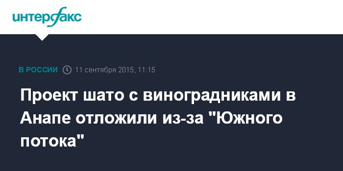Москва. 11 сентября. INTERFAX.RU - Проект строительства премиальных шато с собственными виноградниками в окрестностях Анапы пришлось отложить, поскольку на его территории прошел маршрут "Южного потока", сообщил журналистам исполнительный директор компании "Фонд Юг" Эдуард Жучков.