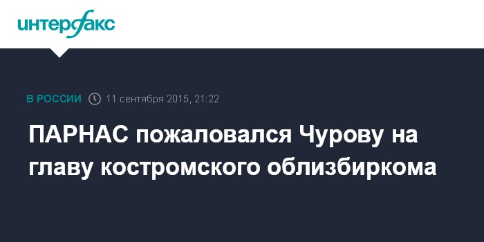 Москва. 11 сентября. INTERFAX.RU - Партия ПАРНАС обратилась к главе ЦИК Владимиру Чурову с требованием пресечь нарушение закона его подчиненными, которое, по мнению авторов обращения, имело место в Костромской области.