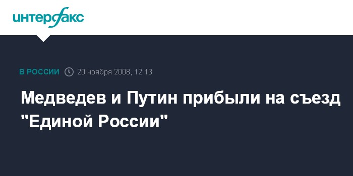 Москва. 20 ноября. INTERFAX.RU - Президент РФ Дмитрий Медведев и премьер-министр, председатель "Единой России" Владимир Путин в четверг днем прибыли на 10-й съезд партии, который собрался в Гостином дворе. Этот съезд впервые пройдет под председательством В.Путина.