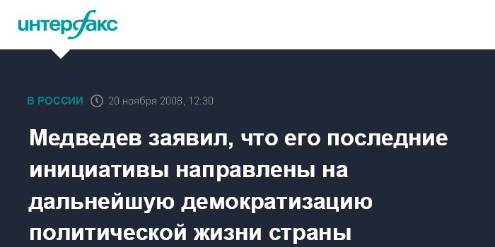 "Десять политических инициатив, которые я перечислил в Послании, обусловлены необходимостью адаптации государственных и политических институтов к современной ситуации, тем вызовам, с которыми сталкивается страна. Они (инициативы - ИФ) направлены на развитие демократии, повышение качества народного представительства в органах власти, на рост числа участников политического процесса и развитие политической конкуренции", - сказал Д.Медведев, выступая в четверг на съезде "Единой России".
