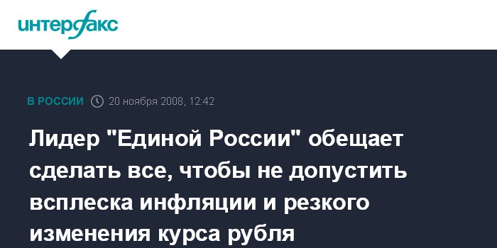 Москва. 20 ноября. INTERFAX.RU - Для предотвращения всплеска инфляции или резкого изменения курса рубля в нынешней ситуации будут использованы все средства, заявил лидер "Единой России" Владимир Путин.