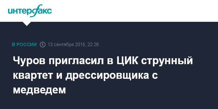 Москва. 13 сентября. INTERFAX.RU - Глава ЦИК РФ Владимир Чуров распорядился организовать в Центризбиркоме выступление струнного квартета и дрессировщика с медведем, которые явились избирательные участки в Ленинградской области в Единый День голосования 13 сентября.