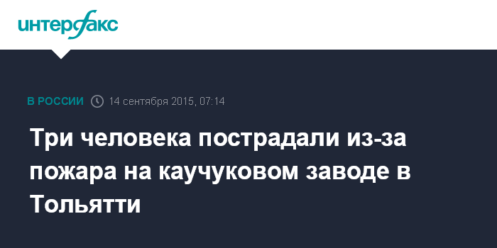 Москва. 14 сентября. INTERFAX.RU - Три человека пострадали в результате хлопка углеводорода на территории каучукового завода в Тольятти, сообщил "Интерфаксу" источник в экстренных службах.